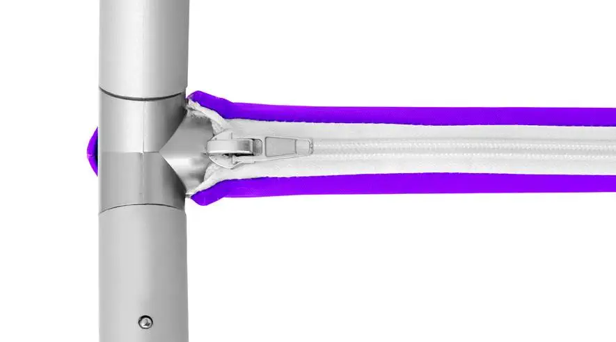 Das Gestell der Zipper-Banner besteht aus Aluminium und lässt sich in kürzester Zeit einfach montieren. Anschließend muss nur noch die bedruckte Stoffhusse über das Gestell gezogen werden. Der Reißverschluss an der Unterseite der austauschbaren Textilbezüge sorgt für ein glattes Druckbild.