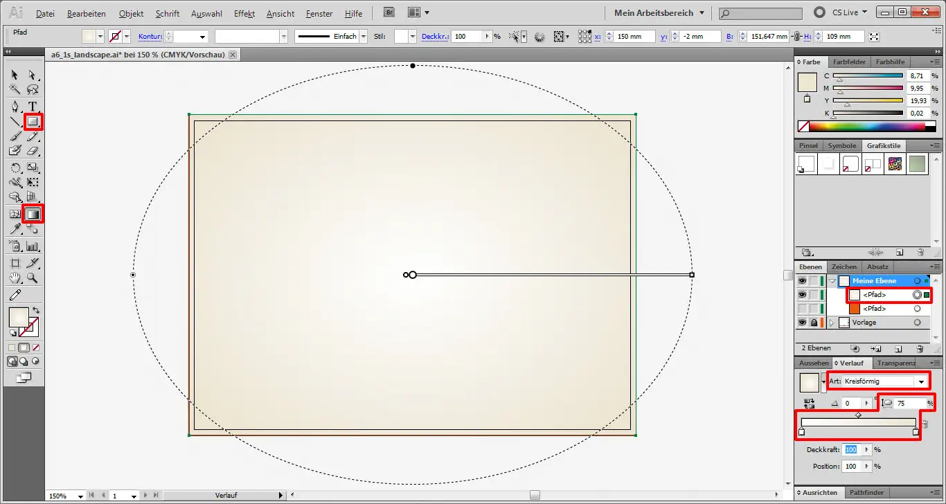 Beginnen wollen wir, in dem wir uns im SAXOPRINT Shop die passende Druckvorlage (in diesem Beispiel: DIN A6-Querformat) herunterladen und diese dann in Adobe Illustrator öffnen (Strg+O). Mit dem Rechteckwerkzeug (M) ziehen wir uns ein Rechteck über den gesamten orangenen Bereich auf. Dieses Rechteck versehen wir mit dem Verlaufswerkzeug (G) mit einem kreisförmigen Verlauf von Weiß (#FFFFFF) zu Beige (#EDE4D2). Den Kreis stauchen wir auf 75 %.