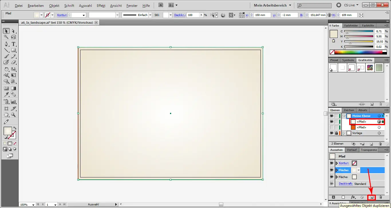 Wir wechseln jetzt in das Aussehen-Fenster und ziehen die soeben bearbeitete Fläche unseres noch aktiven Pfades auf die Schaltfläche „Ausgewähltes Objekt duplizieren“. Damit erstellen wir für unser Rechteck eine zweite Fläche.