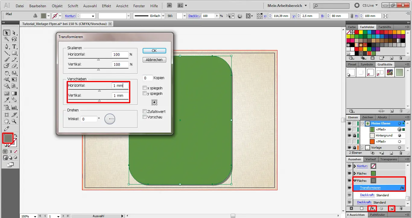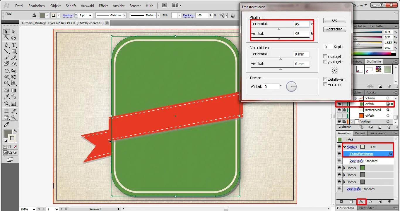Nachdem die Arbeiten an der Schleife zunächst beendet sind, müssen wir nun noch dem grünen Rechteck eine beige Kontur (#EDE4D2) hinzufügen. Dazu wechseln wir in das Aussehen-Fenster und fügen dort eine 3 pt starke Kontur hinzu. Dann gehen wir wieder auf das Effektsymbol und auf Verzerrungs- und Transformationsfilter->Transformieren. Dort verkleinern wir die Kontur in beide Richtungen auf 95 %.