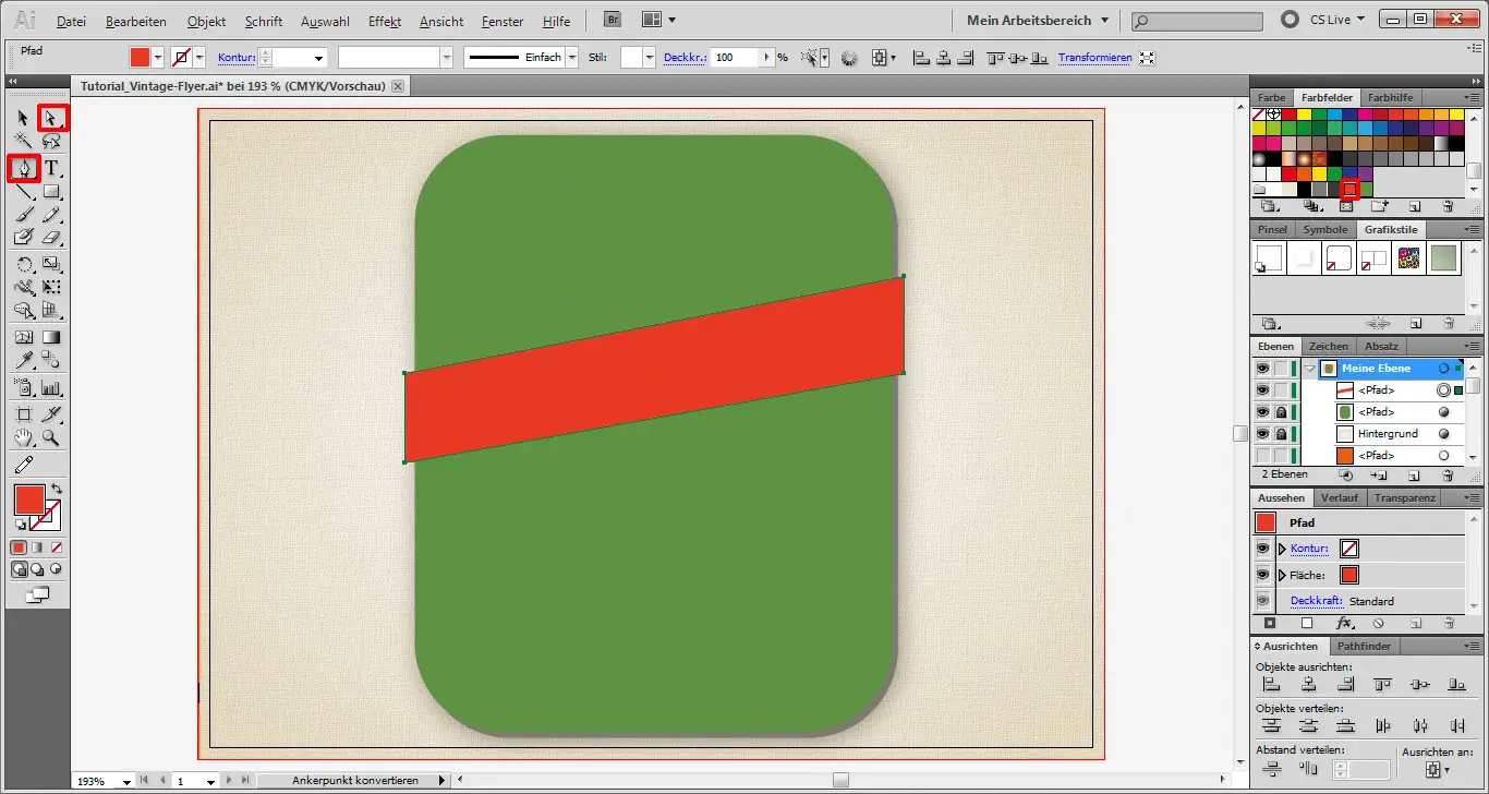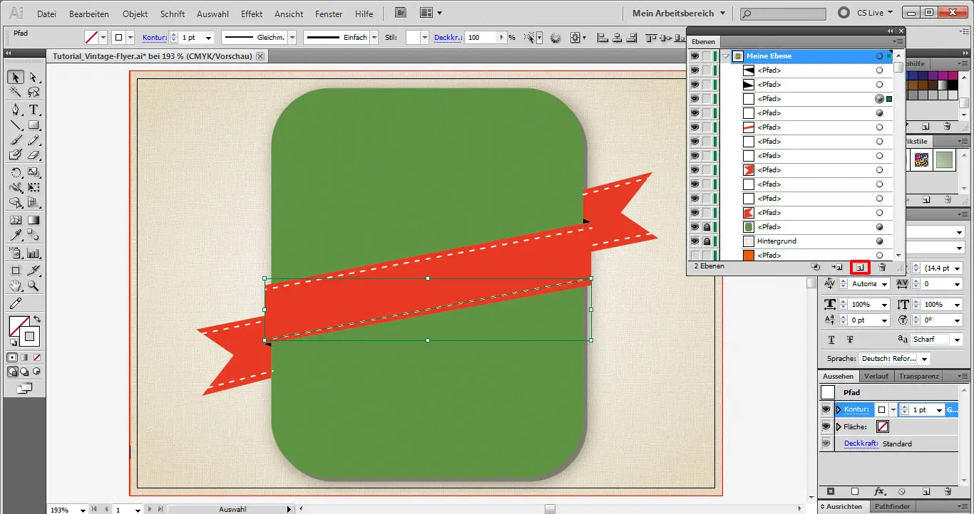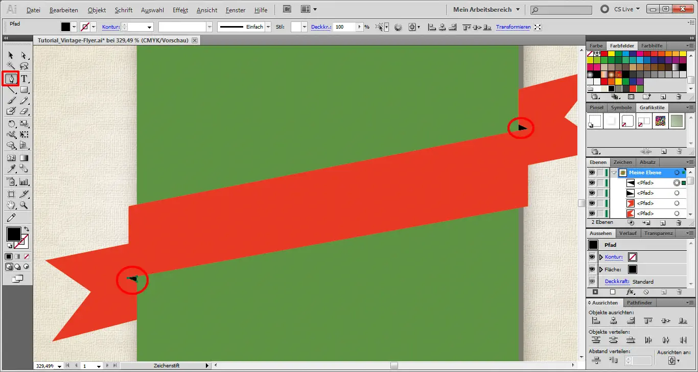 Wir sperren nun dieses Objekt mit Klick auf das Schloss-Symbol. Mit dem Zeichenstift-Werkzeug (P) zeichnen wir uns dann eine orangene Schleife. Die Ankerpunkte können anschließend noch mit dem Direktauswahl-Werkzeug (A) verschoben werden.