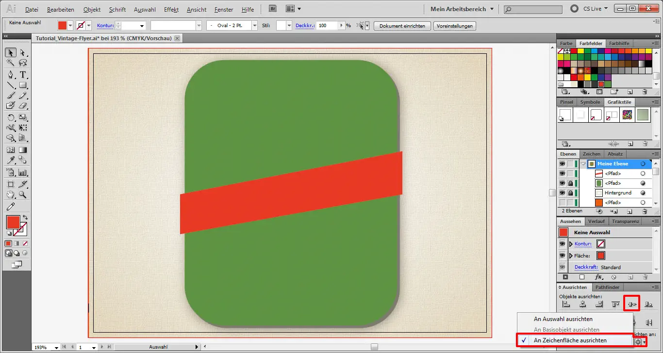 Damit die Schleife dann in der Bildmitte sitzt, markieren wir sie, wählen das Ausrichten-Fenster an und klicken bei „Ausrichten an“ „An Zeichenfläche ausrichten“ an. Dann klicken wir auf das markierte Symbol, um die Schleife vertikal zu zentrieren.