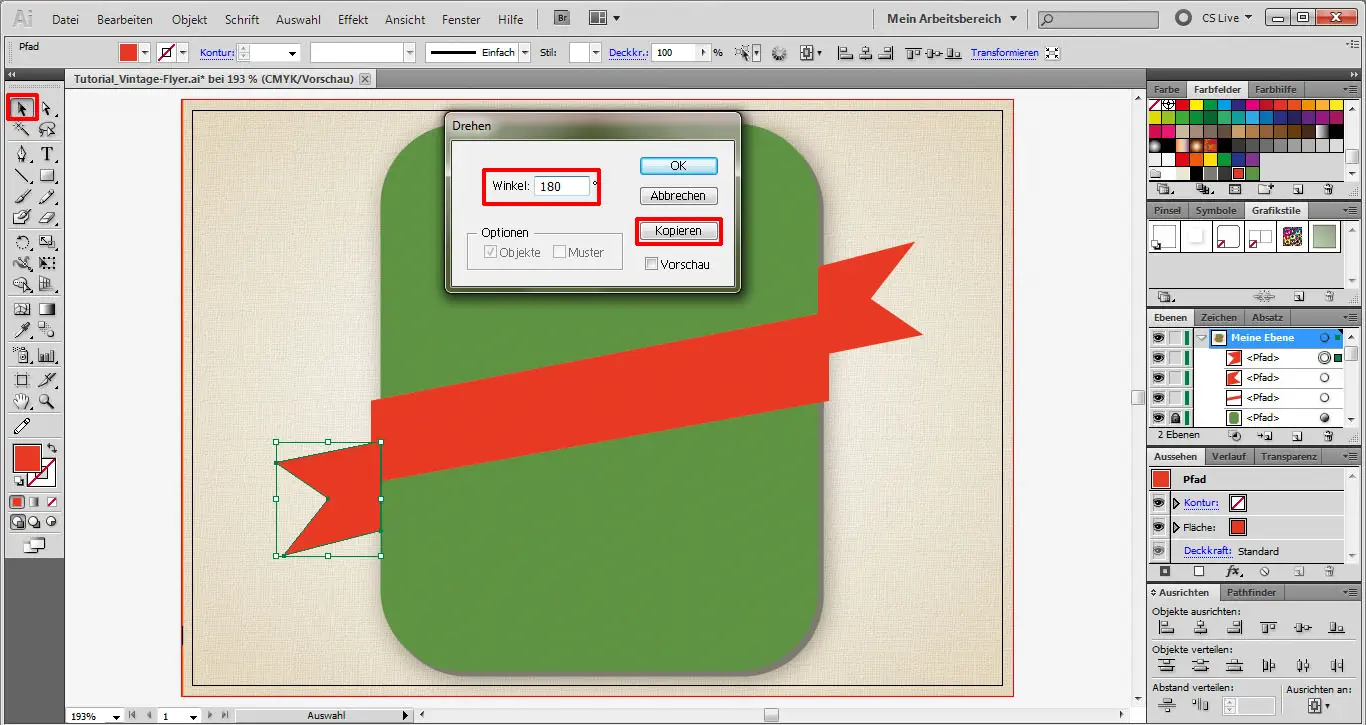 Mit diesem immer noch aktivem Objekt gehen wir in der Menüleiste auf Objekt->Transformieren->Drehen. Dort geben wir 180° ein und klicken auf „Kopieren“. Dann verschieben wir die Kopie an die hier dargestellte Position.