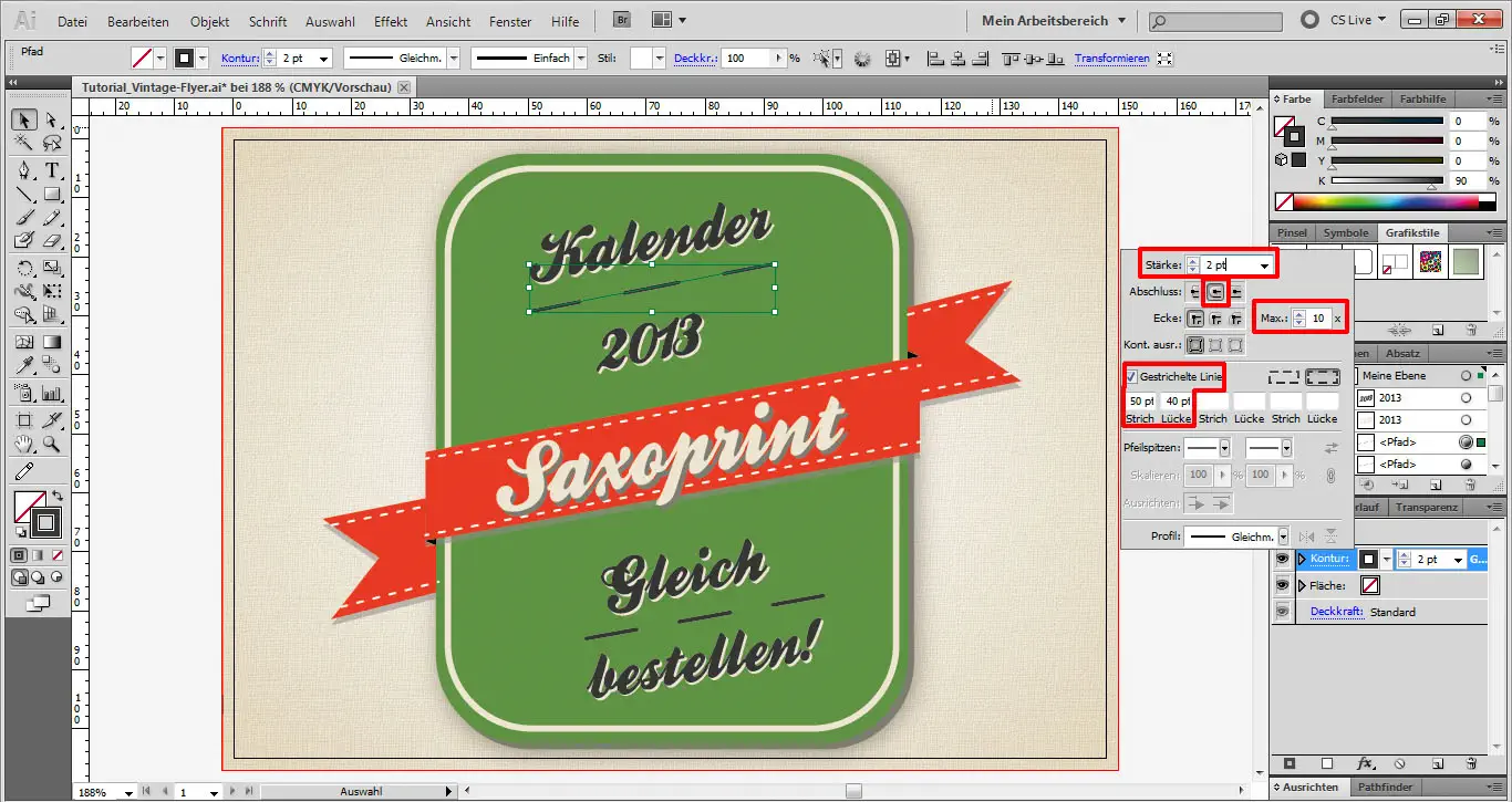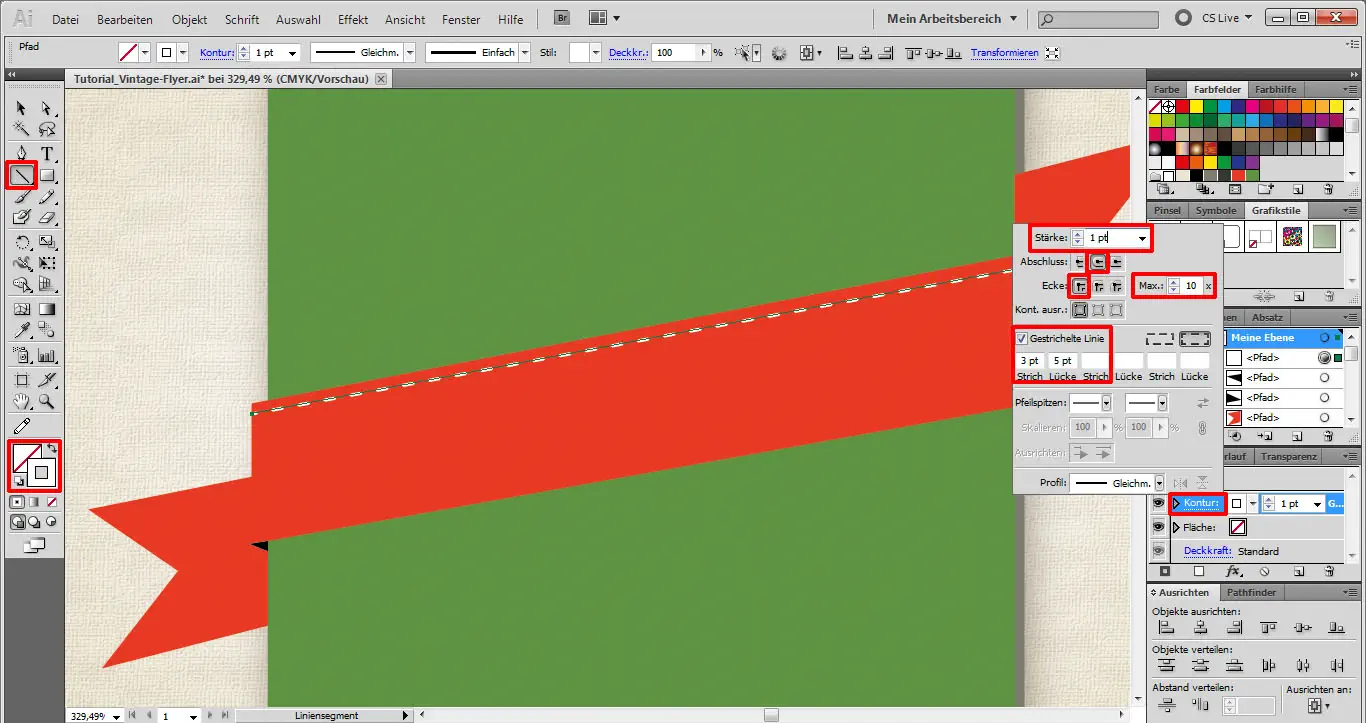 Im Aussehen-Fenster bearbeiten wir das Erscheinungsbild der Linien. Dazu nehmen wir in diesem Fenster die folgenden Einstellungen für die Kontur vor: Stärke 2 pt, Maximal 10 Ecken, Gestrichelte Linie (Strich 50 pt, Lücke 40 pt).
