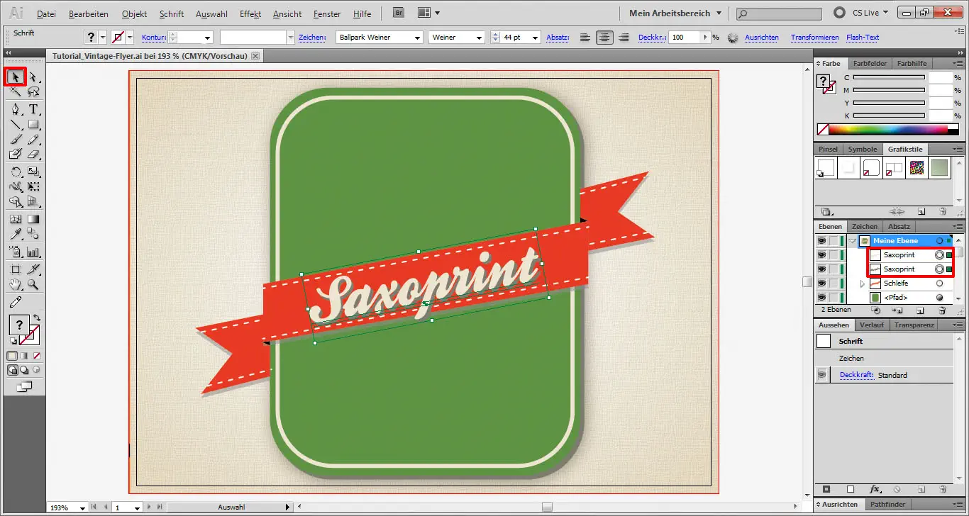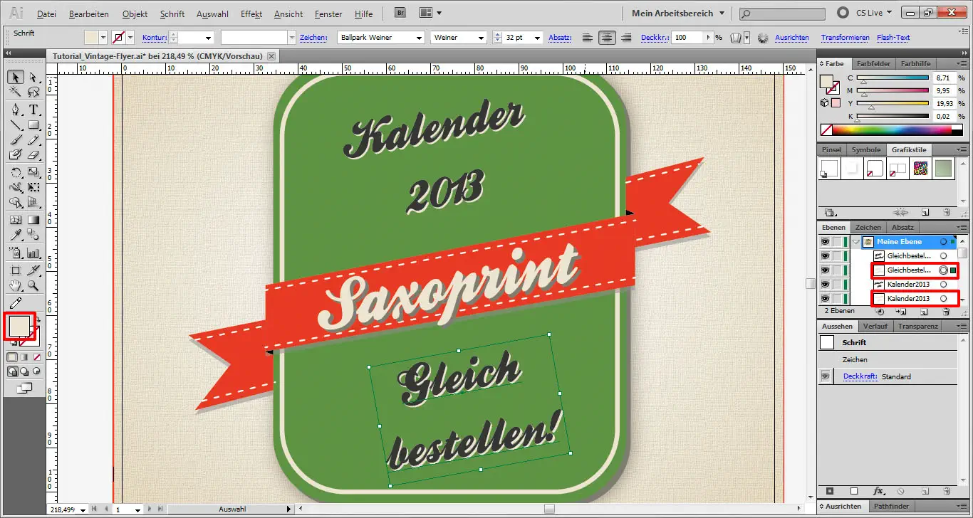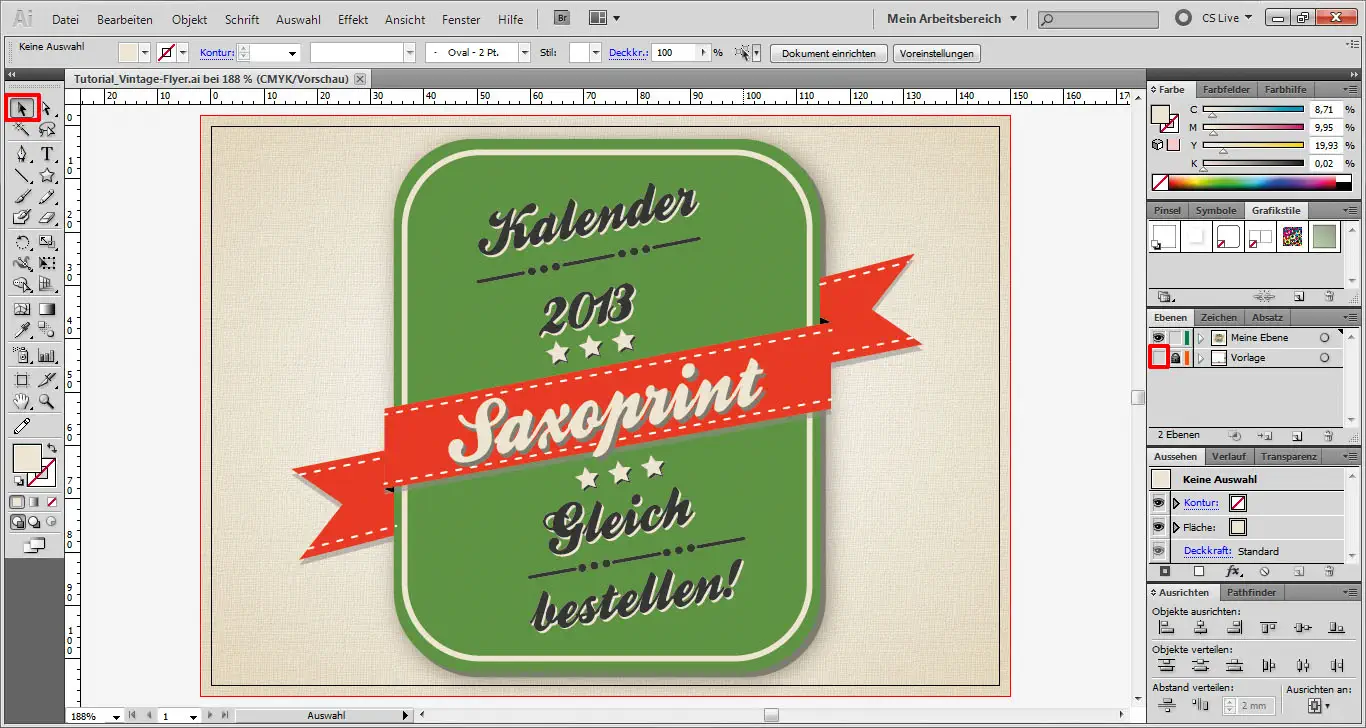 Diese beiden Gruppen kopieren wir erneut und schieben die Kopien nach unten über die untere Schriftebene. Dann machen wir die Vorlagenebene mit Klick auf das Augensymbol unsichtbar und schon kann unser Flyer bei Saxoprint.de in den Druck gehen.