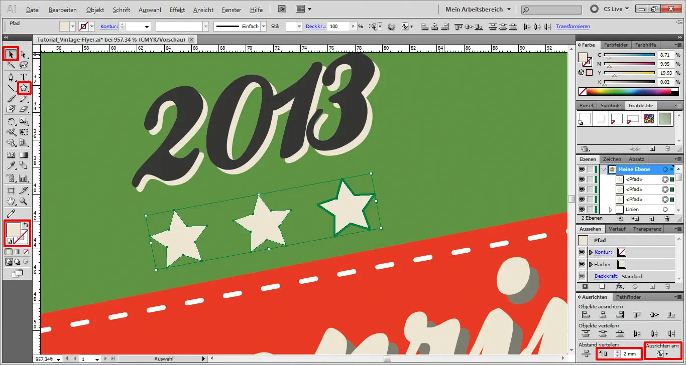 Jetzt erstellen wir noch drei beige Sterne (#EDE4D2) mit dem Stern-Werkzeug und ordnen diese wie im Bild zu sehen mit einem Abstand von 2 mm an.