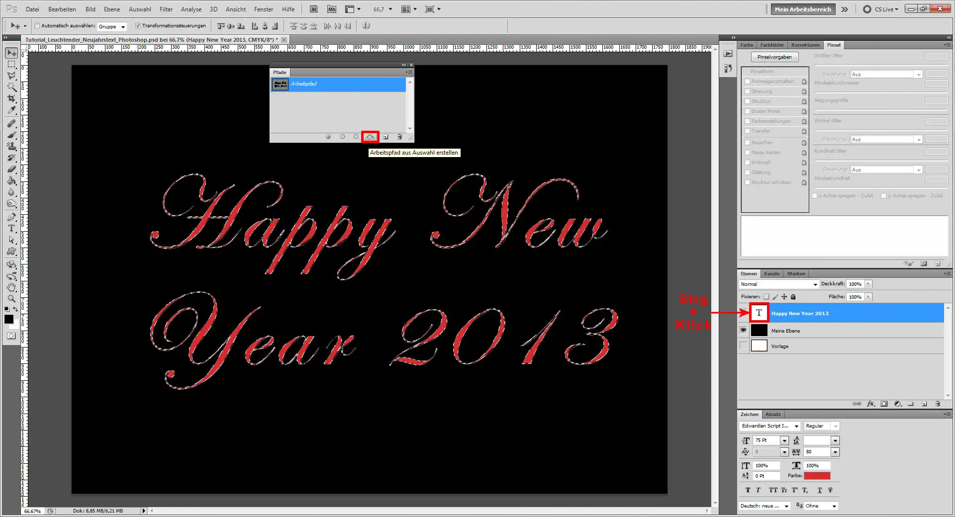 Da nun alles perfekt sitzt, könnt ihr die Ebene „Vorlage“ wieder ausblenden und die Ebene „Meine Ebene“ erneut einblenden. Dann klickt ihr mit gedrückter Strg-Taste auf die Ebenenminiatur der Textebene, um diese auszuwählen. Dann wechselt ihr ins Fenster „Pfade“ und klickt dort auf die markierte Schaltfläche „Arbeitspfad aus Auswahl erstellen“, um aus dem markierten Text einen Pfad zu erstellen.