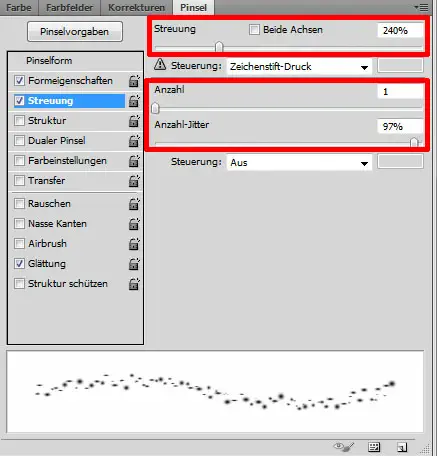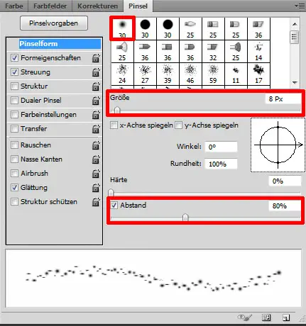 Nun stellen wir Weiß (#FFFFFF) als Vordergrundfarbe ein und aktivieren das Pinsel-Werkzeug (B). Dann stellen wir im Fenster „Pinsel“ einen weichen Pinsel, mit den unten in den Bildern zu sehenden Spezifikationen, ein