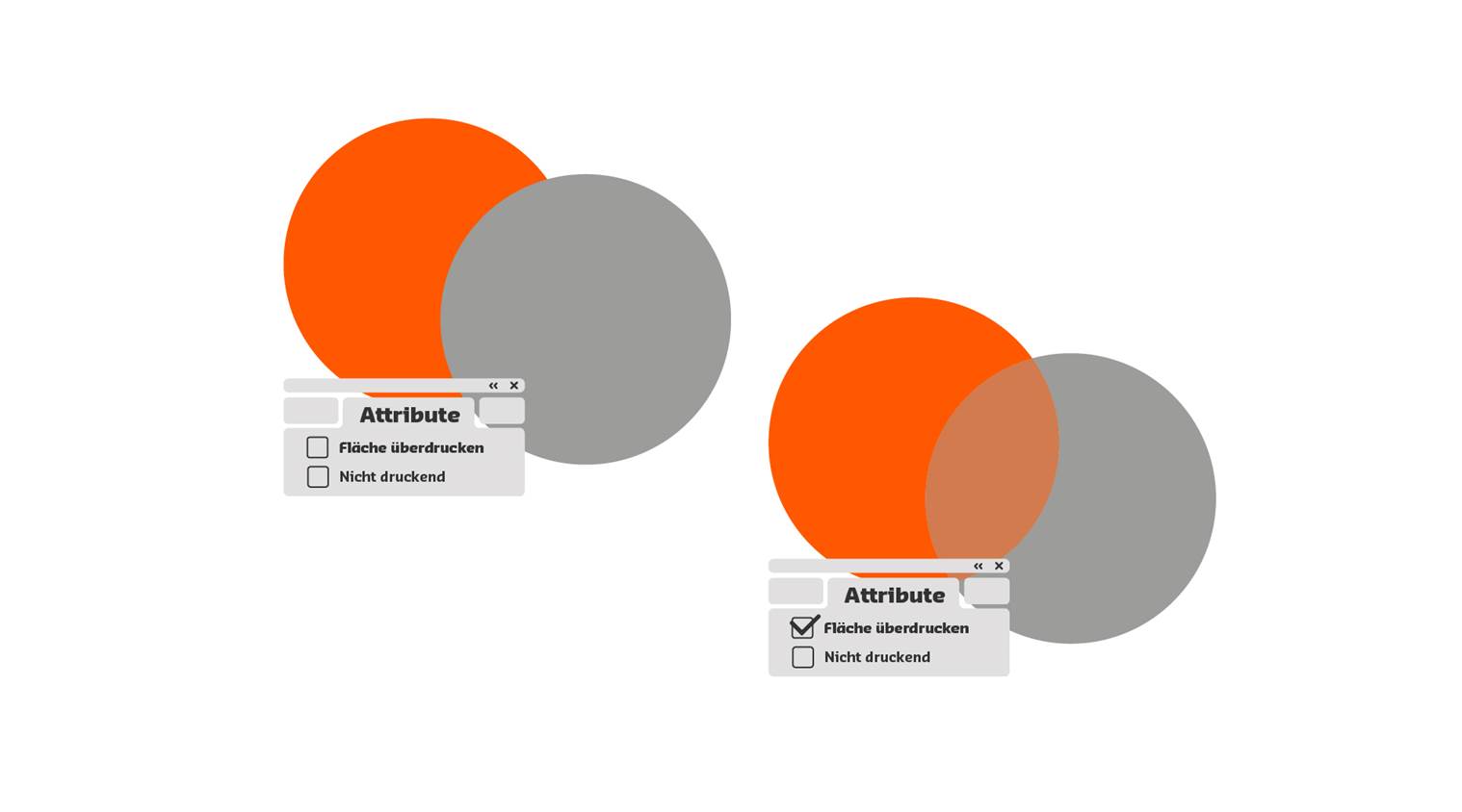 Erläuterung: Fälschlich als überdruckend definierte Farben sind ein häufiger Fehler in Dokumenten, da die sich daraus ergebenden Farbmischungen von Vorder- und Hintergrundfarbe oft am Bildschirm und auch auf vielen Farbdruckern und Proofgeräten nicht dargestellt werden. Bei der Ausgabe kann man daher unliebsame Überraschungen erleben.